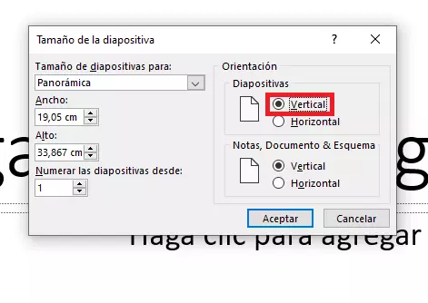 En el cuadro de diálogo, podrás seleccionar el tamaño deseado de cada una de las diapositivas. No obstante, para cambiar la orientación de la hoja en PowerPoint no tendrás que realizar complicados cálculos y bastará con marcar la opción “Verticalˮ del apartado “Orientaciónˮ. Por último, presiona “Aceptarˮ: