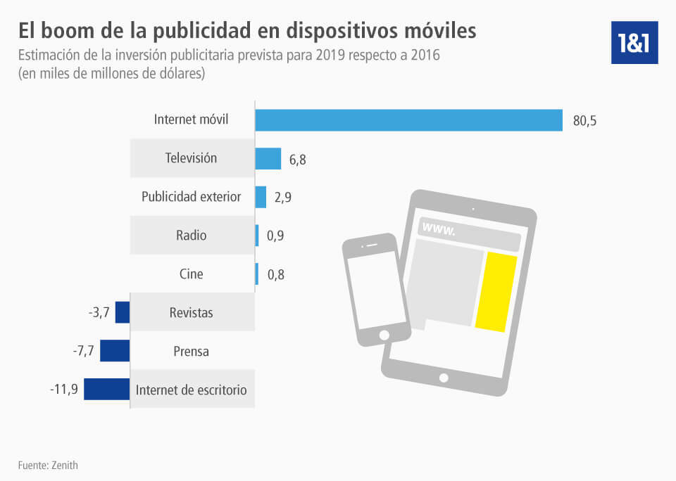 Este término describe un instrumento de marketing que consiste en el envío de mensajes publicitarios a terminales móviles gracias al uso de la tecnología de comunicación móvil. Por lo tanto, dicha publicidad engloba todas las estrategias publicitarias destinadas a smartphones y tablets, incluyendo, además de campañas con banners clásicos, también el diálogo directo con el cliente a través de servicios de mensajería instantánea. Este ámbito del llamado mobile advertisement o marketing móvil ha ganado una relevancia espectacular en los últimos años debido al uso constante y creciente de Internet móvil. A ello han contribuido las mejoras en el acceso a Internet desde el dispositivo móvil y en las prestaciones de los propios terminales, lo que ha convertido al smartphone en un sustituto ocasional del pc de escritorio abriendo, al mismo tiempo, nuevas posibilidades para el marketing. No en vano, el comercio móvil es hoy ya un aspecto imprescindible que cualquier tienda online debe considerar. El pronóstico global del presupuesto para publicidad en el año 2019 confirma el crecimiento de la publicidad en dispositivos móviles: