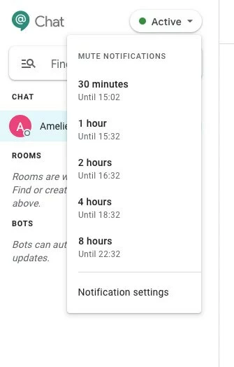 No importa si usas Google Chat a través de una app en tu smartphone o tablet, mediante un navegador o como PWA en tu ordenador de sobremesa: configura cuanto antes cuándo y cómo quieres recibir notificaciones de mensajes nuevos. Para ello, haz clic en el botón “Activo” del campo de menú izquierdo. Una vez hecho eso, puedes seleccionar, por ejemplo, que no quieres que te molesten en las próximas horas. A través de la opción de menú “Ajustes de notificación” puedes realizar más ajustes personales, fijar tiempos de silencio o silenciar notificaciones de contactos determinados.