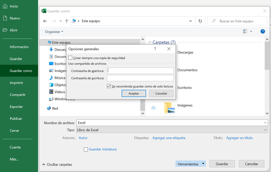 - Borra la contraseña y desmarca la casilla “Se recomienda guardar como solo lectura” y guarda el archivo.