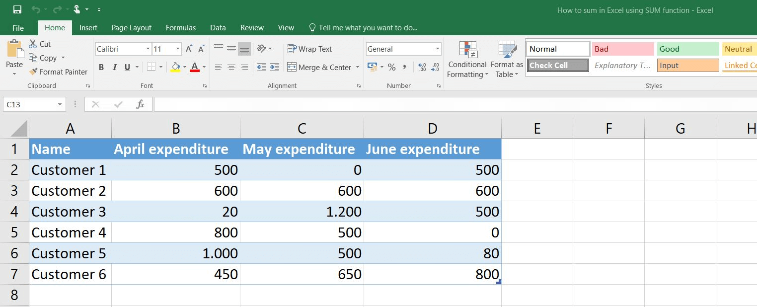 Como ya se ha mencionado, conviene especialmente usar la función SUMA cuando se quieren sumar varios valores, con la única condición de que dichos valores ya estén guardados en celdas separadas del documento Excel. Para las siguientes explicaciones tomaremos como ejemplo un conjunto de datos que contienen los gastos mensuales de seis clientes entre abril y junio:
