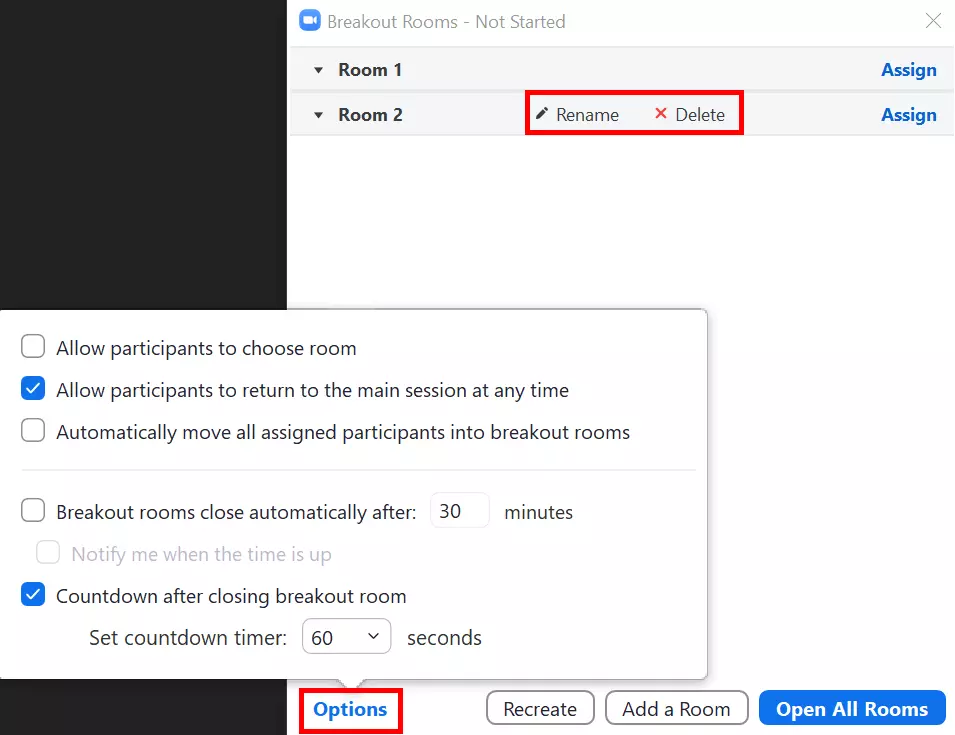 - Paso 3: Para establecer un límite de tiempo para las breakout sessions, puedes ir a “Opciones” y definir un tiempo a partir del cual las breakout rooms se cerrarán automáticamente. Una vez cerrada la breakout room se redirigirá a los participantes a la reunión principal. También puedes hacer que se muestre una cuenta atrás en las breakout rooms para que los participantes sepan cuánto tiempo queda hasta que se cierre la sala.