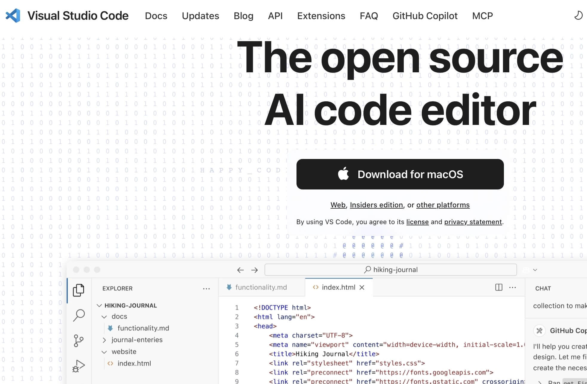 Visual Studio Code, más conocido como VS Code, es un editor de código abierto de Microsoft que, desde su lanzamiento en 2015, se ha convertido rápidamente en el entorno de desarrollo más popular del mundo. Como alternativa gratuita y multiplataforma a Dreamweaver, destaca por su gran flexibilidad, estructura modular y una comunidad muy activa. VS Code funciona en Windows, macOS y Linux, y su versión básica ya incluye muchas funciones que satisfacen las necesidades de los desarrolladores web modernos. Entre ellas se encuentran la integración con Git, el resaltado de sintaxis, la autocompletación inteligente (basada en IntelliSense), un terminal integrado y la vista previa en vivo mediante extensiones adecuadas.