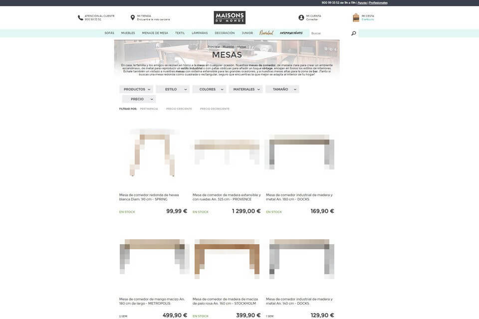 Bajo la búsqueda específica “mesas de madera maciza” encontramos, como landing page una página de categoría clásica de la compañía de muebles Maisons du Monde con una amplia gama de opciones que corresponden a la búsqueda hecha previamente. Cada producto cuenta con una foto y su respectivo precio, lo que facilita la decisión de compra. Adicionalmente se muestra información sobre la disponibilidad del producto. La parte superior de la página cuenta con funciones de búsqueda, categorización y filtros que facilitan la navegación del usuario. El diseño de la página es agradable y, por ejemplo, uno de los elementos de llamada a la acción aparece al deslizar el cursor sobre alguno de los productos.