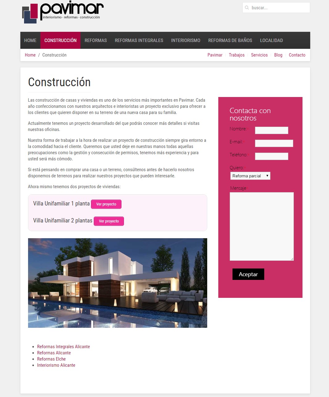 Pavimar también recibe a sus visitantes con una gama de colores y un diseño consecuente con su imagen corporativa. La sencillez de la web facilita la navegación, además de presentar la información correspondiente, así como dos ejemplos de modelos de construcción que ciertamente tendrán un impacto en la decisión de compra del usuario. La llamada a la acción no solo incluye los botones para ver los posibles proyectos, sino también un formulario de registro con el que seguramente se generará un primer contacto con el cliente, siendo este, a su vez, un lead cualificado.