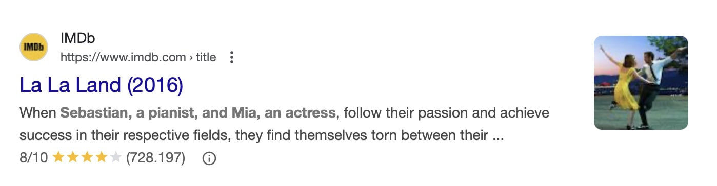 En la siguiente captura de pantalla se muestra una búsqueda en Google del ejemplo de la película “La La Land”, ganadora de seis premios Óscar. Las SERP muestran la entrada de la base de datos de películas en Internet (IMDb) junto con la valoración media de los usuarios en una escala del 1 al 10, una representación gráfica en forma de estrellas y el número total de votos emitidos:
