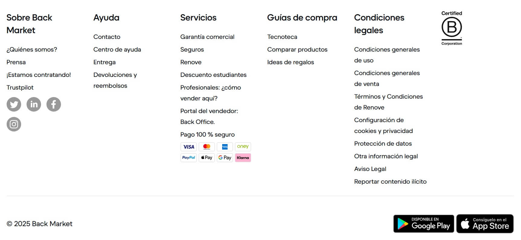 La tienda online Back Market vende electrónica reacondicionada, desde smartphones hasta depiladoras. Su footer incluye algunos elementos especiales. Entre ellos, un enlace al portal de reseñas Trustpilot, cuyas valoraciones transmiten seguridad y generan confianza. Otro punto positivo es la mención de la garantía de 12 meses. En la sección de footer “Sobre nosotros”, el enlace “¿Quiénes somos?” resume de forma rápida y clara la propuesta de la empresa.