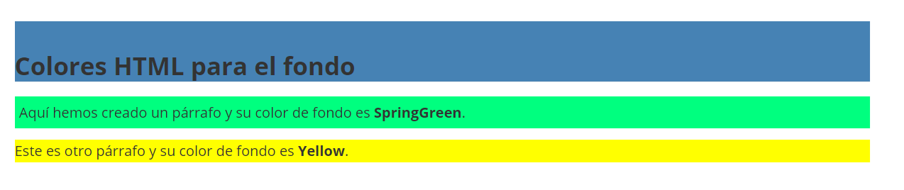 <element style="background-color: valor de color;">htmlEn el siguiente ejemplo, utilizamos los nombres de colores para establecer el color de fondo del encabezado <h2> en “SteelBlue”. El texto se resalta en el primer párrafo con el valor de color “SpringGreen” y en el siguiente con “Yellow”: