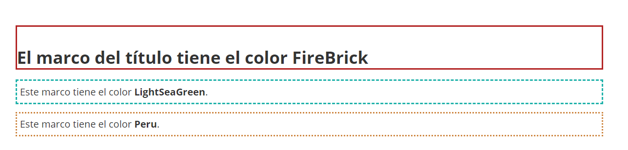 <element style="border: otros parámetros del valor del color;">htmlEn este ejemplo utilizamos la tercera variante para la definición del color, esto es, los valores RGB. El marco de nuestro título recibe el valor rgb(178, 34, 34) (FireBrick). Los dos párrafos están enmarcados con rgb(32, 178, 170) (LightSeaGreen) y rgb(205, 133, 63) (Peru).