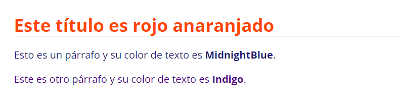 <element style="color: valor de color;">htmlPara la especificación del color en este ejemplo, utilizamos los valores hexadecimales de los colores HTML con fines ilustrativos. Para ello, especificamos OrangeRed (#FF4500) como color de fuente para el título. La primera sección se mantiene en el color MidnightBlue (#191970) y la segunda sección en Indigo (#4B0082):