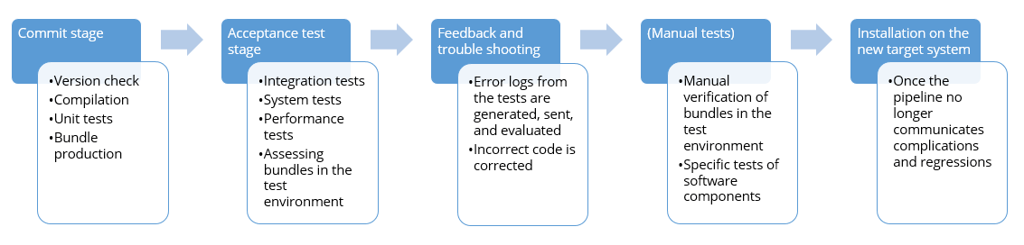- Fase de commit (Commit Stage): en esta primera fase de prueba se ejecutan tests de la versión del software, se desarrollan sus componentes y, cuando es necesario, se compilan. Además, se llevan a cabo las pruebas unitarias pertinentes. Si se superan con éxito todas las pruebas, la fase se da por finalizada. En este momento, se compilan y se almacenan en el repositorio los artefactos binarios de los componentes de software. Por todo lo anterior, se trata de un paquete que afecta decisivamente a la funcionalidad del pipeline porque determina el estado en el que se encuentra el software. Además, este paquete incluye todos los datos que serán instalados en un momento posterior en el sistema de destino. Los resultados de las pruebas en la fase de commit pueden asignarse de esta manera a las modificaciones concretas realizadas sobre el código fuente, que es precisamente una de las ventajas más significativas de la entrega continua.