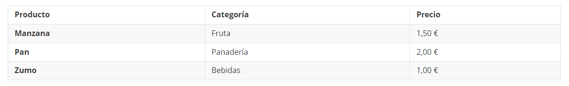Si añadimos un encabezado <caption> con el texto “Tabla de ejemplo de productos y precios” a nuestro ejemplo anterior, el código quedaría así: