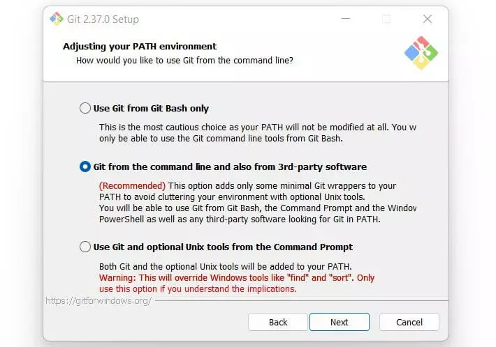 - Configuración del entorno PATH: aquí elegirás si solo Git Bash puede usar Git o si también quieres tener en cuenta el software de terceros. La segunda opción es la más recomendable, porque incluye el símbolo del sistema y el software de terceros. A continuación, haz clic en “Next”.