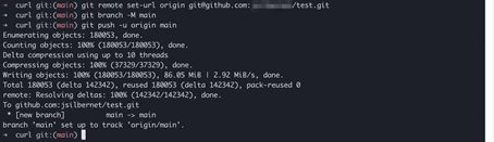 Siguiendo las instrucciones de GitHub, hay que cambiar la URL push del clon local de cURL en nuestro sistema para utilizar nuestro repositorio vacío de GitHub como origen. También establece la rama como “main” o principal. A continuación, ejecuta git push; la operación se completa con éxito y utiliza la clave SSH previamente creada para la autenticación en GitHub.