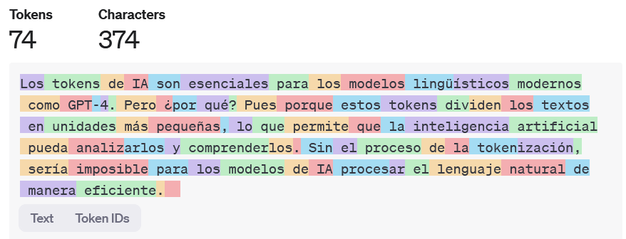El modelo GPT-4o divide este texto, que contiene 374 caracteres, en 74 tokens, como se muestra a continuación: