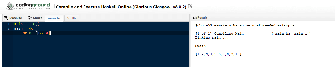 Para ejecutar y presentar los resultados de los siguientes fragmentos de código de este tutorial de Haskell, se utiliza el entorno de desarrollo web Online Haskell Compiler.