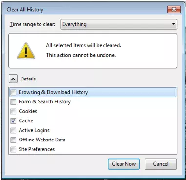 - Para borrar toda la caché selecciona “Todo” (“Everything”) y en la pestaña “Detalles” (“Details”) marca la opción “Caché”, las demás opciones pueden permanecer sin marcar.