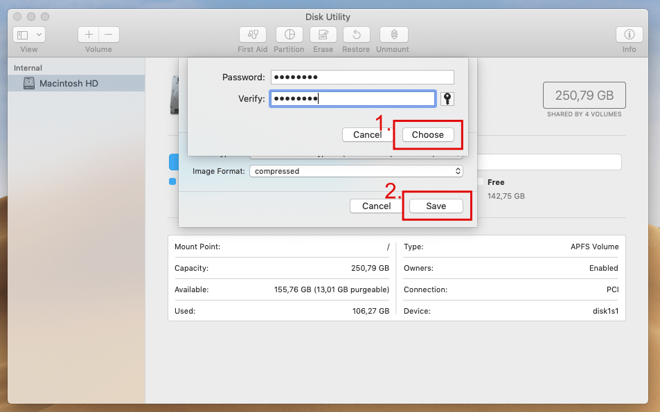 Paso 7. Confirma tu contraseña haciendo clic en el botón “Aceptar” para iniciar la creación de una carpeta protegida con la aplicación “Utilidad de Discos” en tu Mac.