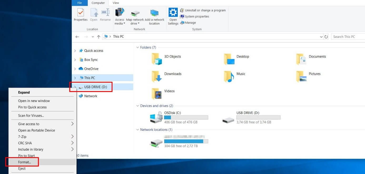 Luego, busca en el lado izquierdo del explorador la memoria USB correspondiente, haz clic en ella con el botón derecho del ratón y selecciona la opción “Formatear” (Format):