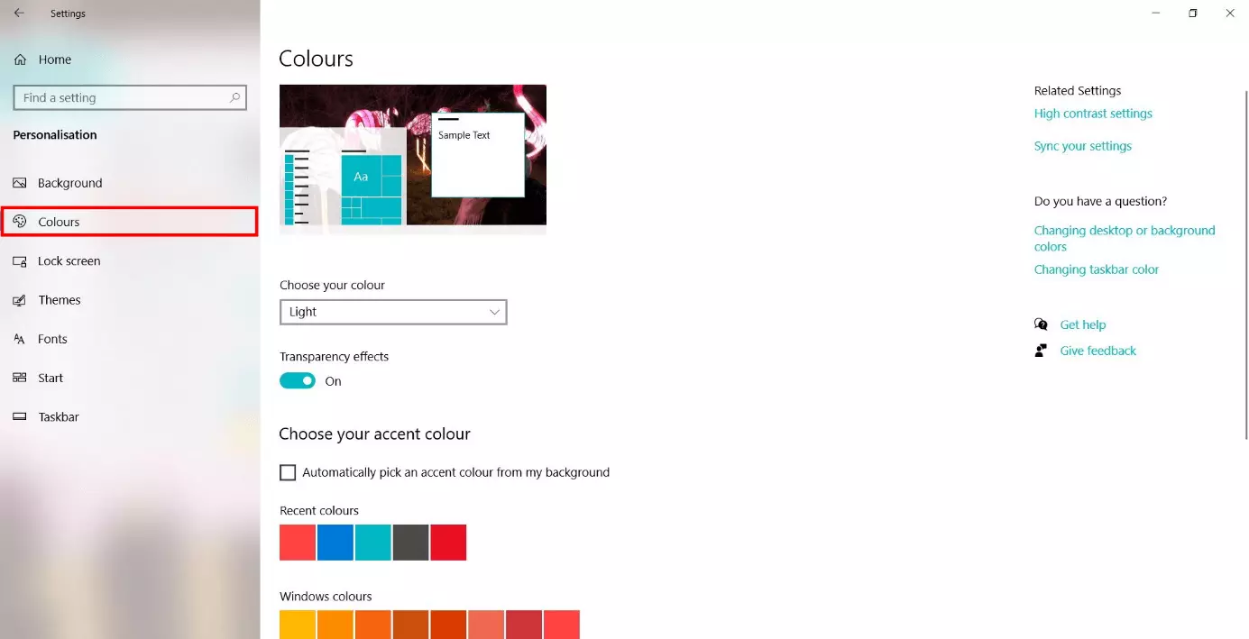También tienes la opción de seleccionar el color de énfasis. Al personalizar esta opción, Windows resaltará ciertos elementos en el color seleccionado. Una vez seleccionado, el color en cuestión se marca con un tic en la esquina superior derecha. Desplázate hacia abajo para establecer el color de otras áreas, como la de Inicio, la barra de tareas o el centro de actividades.