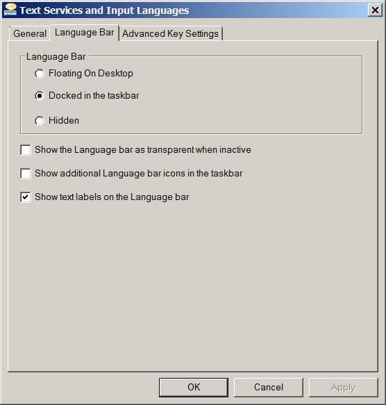 Además de estas opciones, también se presentan casillas para hacer la barra de idioma transparente y mostrar en ella iconos adicionales o etiquetas de texto. Dichas etiquetas de texto son importantes si se desancla la barra de idioma de la barra de tareas y se ubica de forma aislada en otro lugar, porque entonces se muestra el nombre completo del teclado elegido.