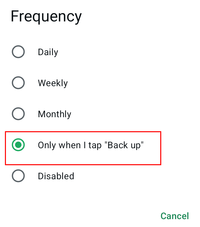 Paso 7: a continuación, en “Frecuencia” (Frequency), selecciona los intervalos en los que deseas crear una copia de seguridad en Google Drive o elige la opción de realizarla manualmente en “Solo cuando toco ‘Guardar’” (Only when I tap ’Back up).
