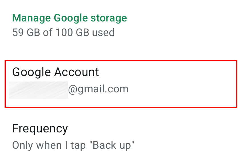 Paso 6: en “Cuenta de Google” (Google Account), selecciona la dirección de Gmail que deseas usar para la copia de seguridad de WhatsApp en Google Drive.