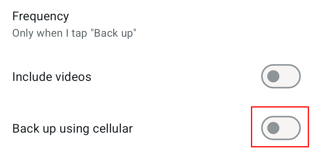 Paso 8: también puedes especificar si quieres guardar la copia de seguridad en la nube usando el wifi o tus datos móviles. Para ello, activa o desactiva la opción “Guardar usando datos móviles” (Back up using celular).