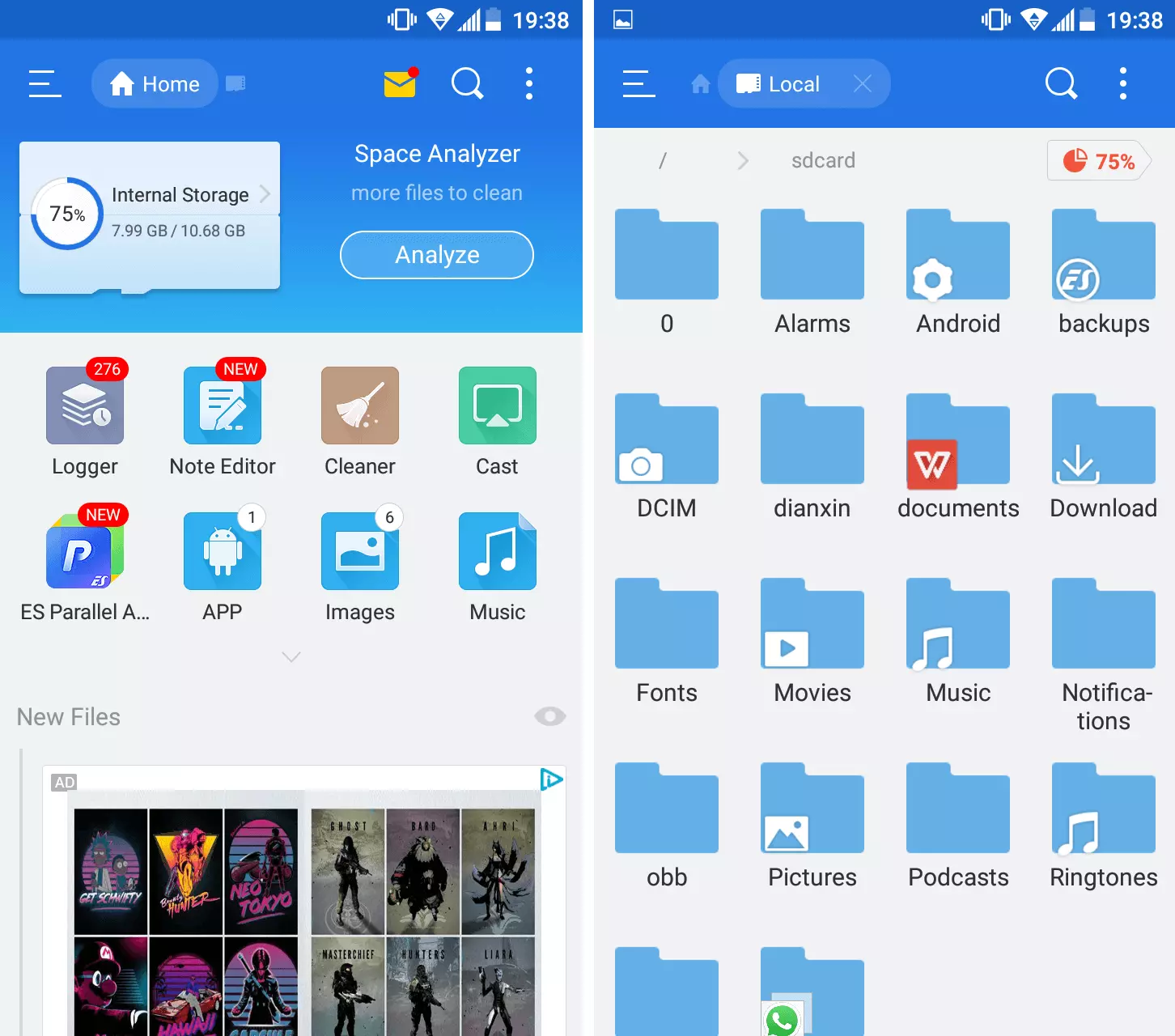Uno de los exploradores para Android más completos es el ofrecido por la compañía china EStrongs Inc. desde 2013. ES Explorador de Archivos está disponible en más de 30 idiomas diferentes. Según el fabricante, actualmente lo utilizan más de 300 millones de usuarios en todo el mundo para gestionar sus propios documentos y contenidos multimedia, así como para las aplicaciones instaladas en dispositivos Android. La potente aplicación de gestión de archivos, que requiere unos 26 MB de espacio en disco, es gratuita en su versión básica, pero a cambio también presenta una gran cantidad de publicidad y redirecciones a otros productos de la empresa de desarrollo, como el ES Task Manager o el ES App Lock. Con ES Explorador de Archivos Pro, EStrongs Inc. ofrece una versión de pago libre de publicidad y que contiene temas adicionales para la interfaz de usuario de la aplicación.