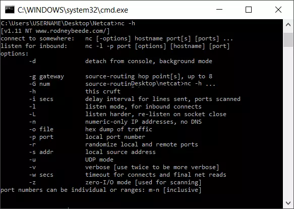 C:\Usuarios\NOMBRE DE USUARIO\Escritorio\netcat>nc -hSi, por ejemplo, quieres definir un servidor o un cliente para la transferencia de datos en la red, debes observar la siguiente sintaxis: