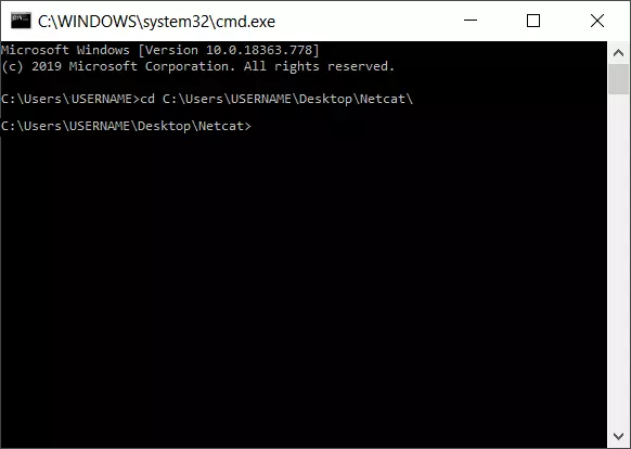 cd C:\Usuarios\NOMBRE DE USUARIO\Escritorio\netcat\El comando “cd” (change directory o cambiar directorio) efectúa el cambio, y la ruta de programa a continuación indica la dirección de la carpeta de almacenamiento de nc.exe. En la línea de comandos, el cambio tiene este aspecto: