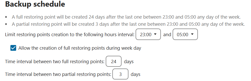 - Planifica la copia de seguridad: define el intervalo de tiempo para la creación de copias de seguridad bajo “Planificación de copias de seguridad”. Si marcas la opción “Permitir la creación de puntos de restauración completos en días laborales” los datos también se guardarán completamente durante la semana. De lo contrario, la aplicación solo realizará una copia de seguridad incremental, lo que tiene la ventaja de que Nextcloud no necesita entrar en modo mantenimiento. Además, también puedes ajustar el intervalo entre las copias de seguridad.