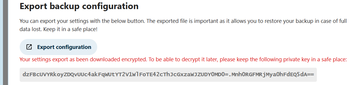 - Exporta la configuración de la copia de seguridad: guarda la configuración como un archivo para respaldar los ajustes. Con la clave asociada (que debe guardarse de manera segura), el archivo exportado permitirá restaurar la copia de seguridad en caso de una pérdida total de datos en nuevo hardware.