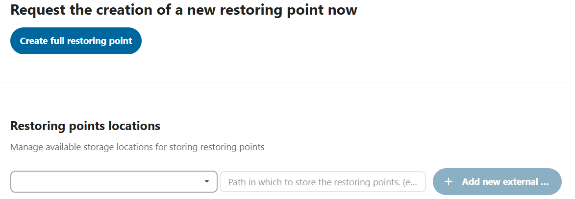 - Establece la ubicación de las copias de seguridad: en “Ubicación de los puntos de restauración” puedes definir dónde se almacenarán las copias de seguridad. Se puede configurar tanto almacenamiento local como externo. Para garantizar la disponibilidad de las copias de seguridad, se recomienda elegir una unidad externa o un servidor diferente como ubicación de almacenamiento.
