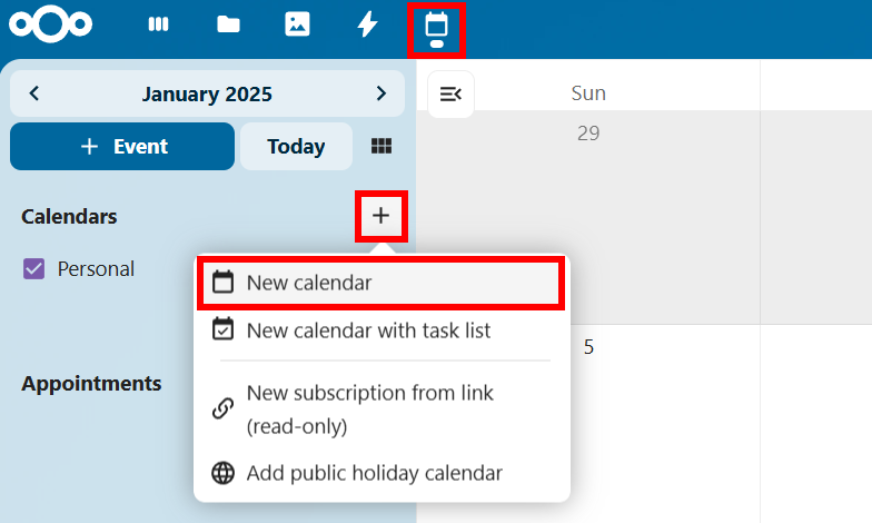 Al abrir Nextcloud Calendar por primera vez (mediante el icono del calendario en el menú principal), se crea un calendario inicial de forma automática. Para añadir más calendarios, sigue estos pasos: