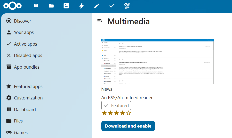- Instala Nextcloud News: haz clic en “Descargar y activar” para instalar la aplicación.
