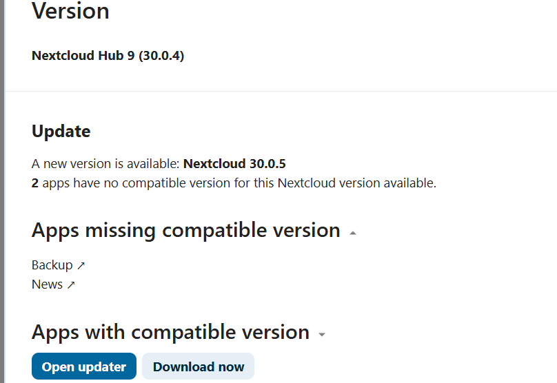 - Haz clic en “Abrir actualizador” (Open updater). Este botón solo aparecerá si hay una actualización de Nextcloud disponible.