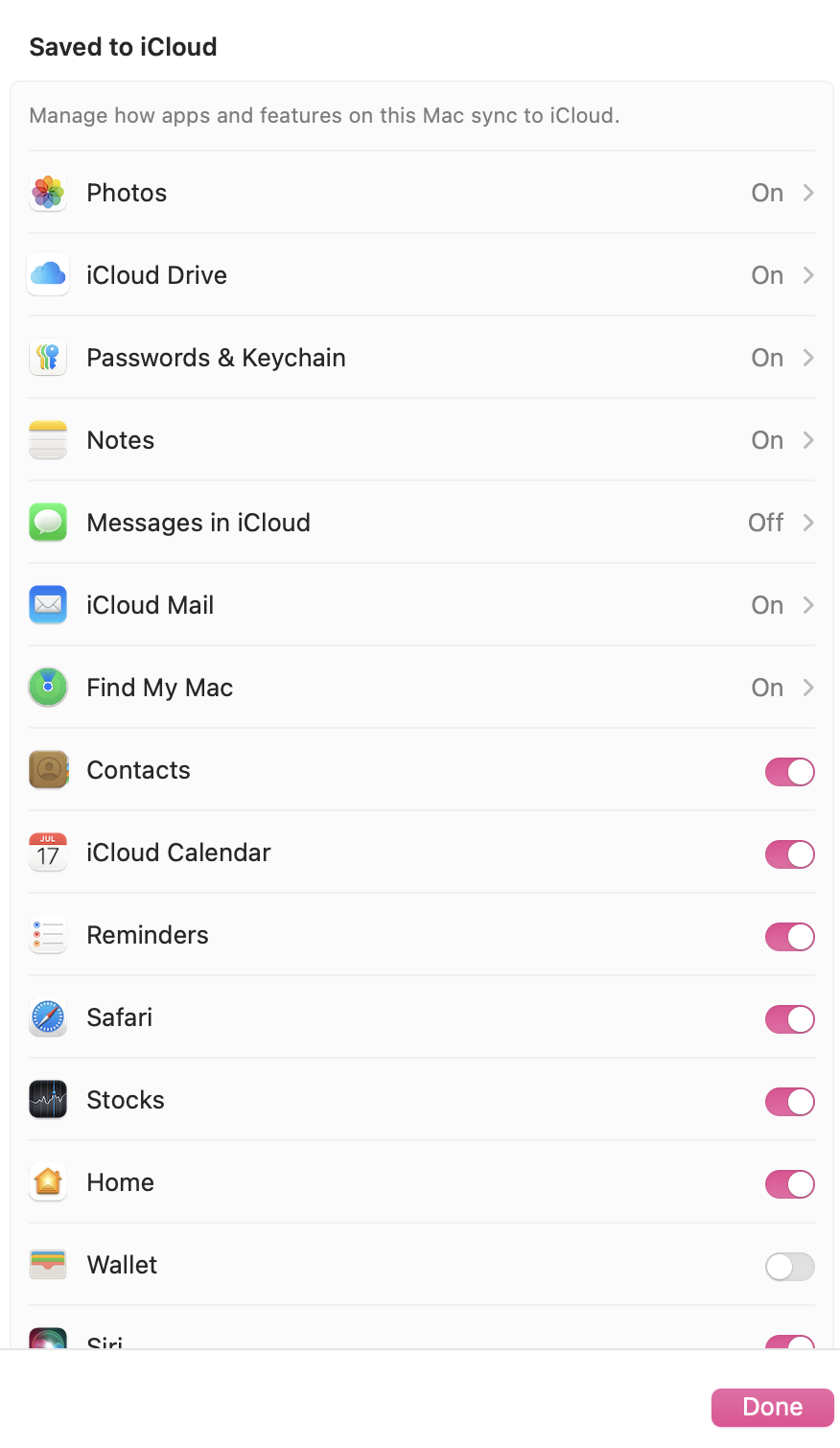 Ahora verás el menú “Guardado en iCloud”. Al hacer clic en el botón “Mostrar todo”, se abrirá una lista de todos los servicios de iCloud disponibles. Puedes activar o desactivar individualmente estos servicios, marcando o desmarcando la casilla correspondiente con un clic. Los cambios realizados en iCloud serán visibles en todos los demás dispositivos Apple en los que hayas iniciado sesión con tu cuenta de Apple.