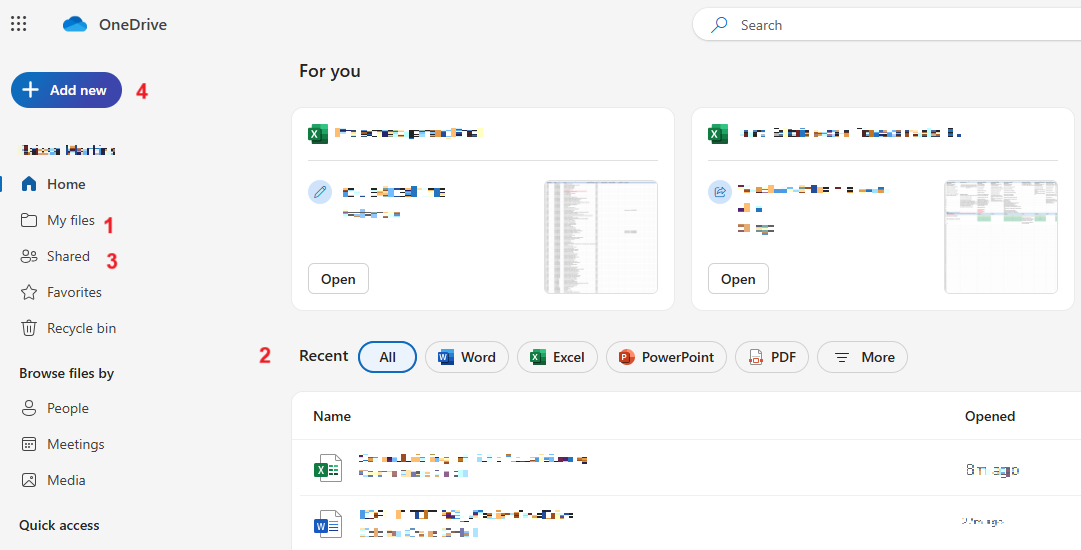 La interfaz de usuario de OneDrive es básicamente intuitiva y fácil de usar: el menú de la izquierda muestra los elementos más importantes, incluidos los contenidos almacenados en la nube en “Mis documentos” (My files) (1). Los documentos y archivos multimedia que has utilizado más recientemente se encuentran en “Utilizados recientemente” (Recent) (2). Los archivos que compartes o editas con otros están en la carpeta “Compartido” (Shared) (3). La opción “Nuevo” (Add new) (4) sirve para crear nuevas carpetas o documentos, o bien para subir nuevas carpetas o archivos a la nube.