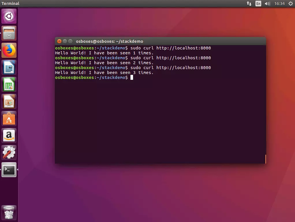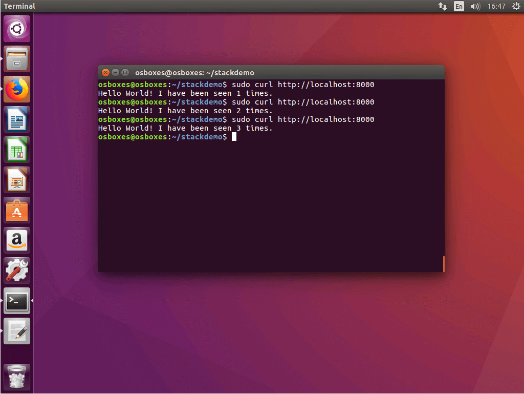Hello World! I have been seen 3 times.3.4 Desconectar la app: si se quiere desconectar el stack, hay que ejecutar el comando docker-compose down con el indicador –volumes.