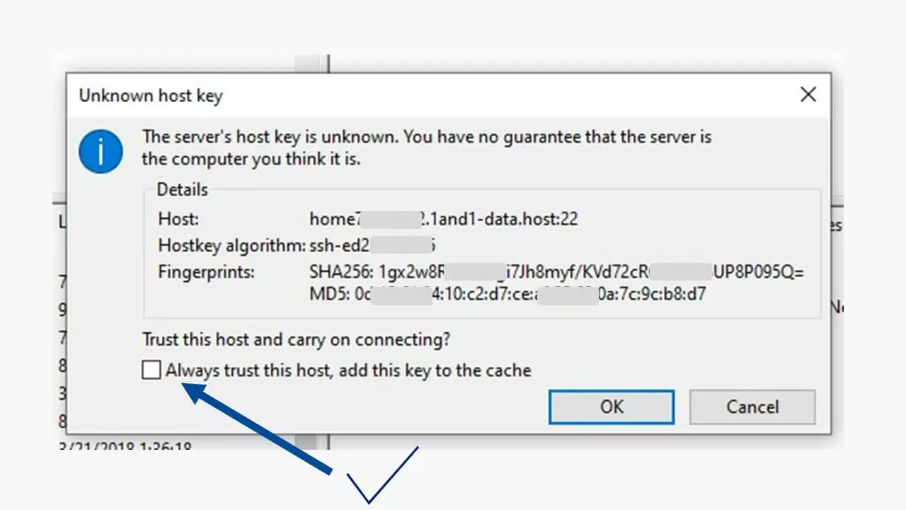 Después hay que comprobar nuevamente que la dirección del servidor es correcta. En la entrada para el servidor “home….-data.host:22” puedes observar que se ha empleado el puerto 22. Marcando la casilla “Confiar siempre en este sitio, añadir su clave a la caché” y haciendo clic en “Aceptar”, se guardan los datos de conexión y se establece la conexión cifrada.