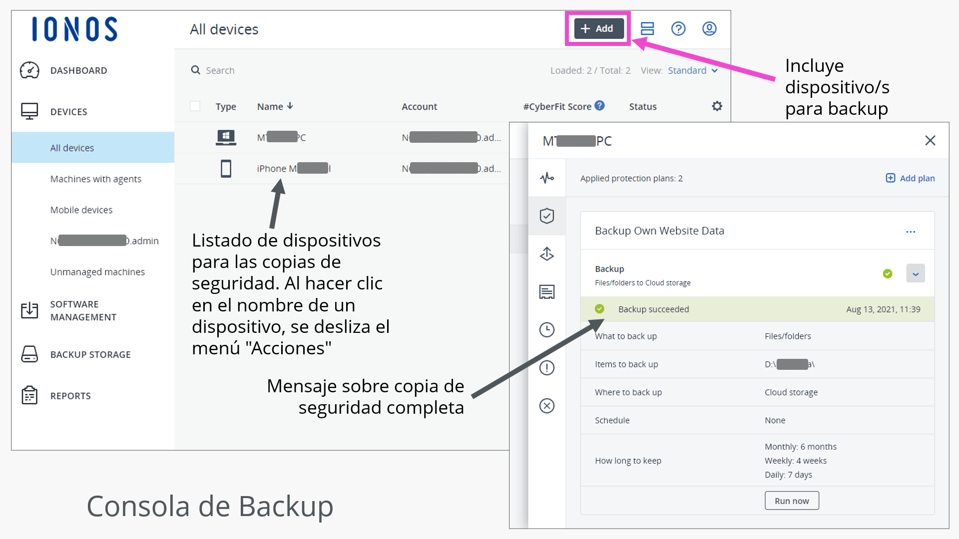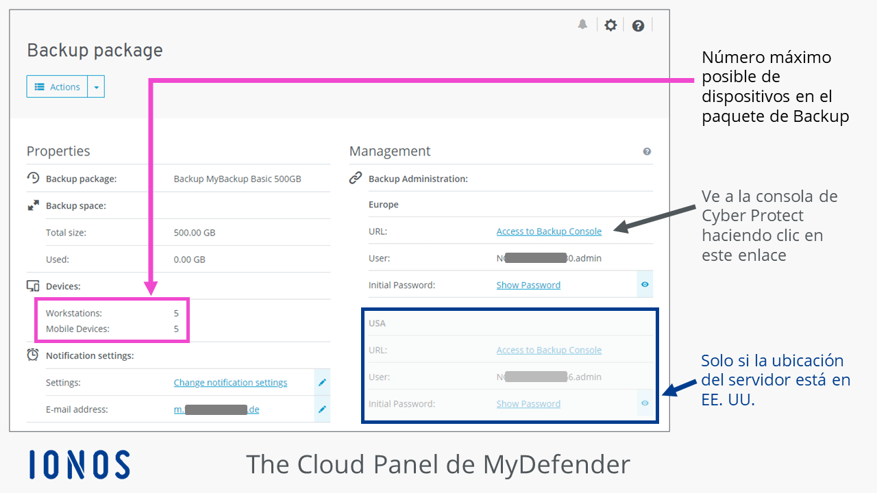 Si quieres ir sobre seguro y hacer copias de seguridad de tus fotos más allá de la vida útil de tus propios discos duros, una solución de copia de seguridad como MyDefender de IONOS podría ser justo lo que necesitas. Todos los datos, incluidas tus fotos, se almacenan en centros de datos españoles con certificación ISO, por lo que no hay que preocuparse por la protección de datos. Gracias a una base de datos de malware constantemente actualizada y a la detección de comportamientos basada en IA, estás protegido contra malware, ransomware y criptominería, así como contra las nuevas amenazas, los llamados ataques 0-day. Las copias de seguridad completas y automatizadas del sistema protegen tus imágenes y otros archivos de la pérdida de datos debida a un fallo del hardware o a un borrado accidental.