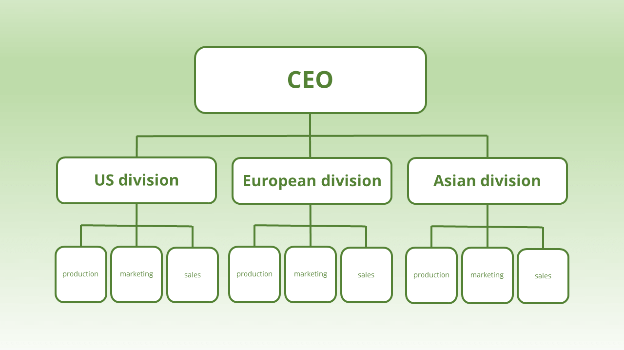 Se trata de una estructura muy fácil de adaptar a las necesidades de la empresa. En ella cada sección se puede concentrar en el ámbito de trabajo que le corresponde y, de esta forma, trabajar más rápido, con mayor coordinación y aplicando una estrategia efectiva. La autonomía que se le asocia lleva consigo una mayor motivación de los empleados. Al mismo tiempo, el hecho de que las secciones estén diferenciadas permite llevar a cabo las distintas actividades de forma más transparente, pudiendo también medir y evaluar su rendimiento con mayor precisión. Este tipo de estructuras organizacionales se encuentran en las grandes empresas que ofrecen una gama de productos y servicios especializados para diferentes mercados. Una subdivisión por regiones ofrece un gran potencial, sobre todo para las empresas con actividad internacional. En estos casos, la toma de decisiones suele tener lugar de forma descentralizada.