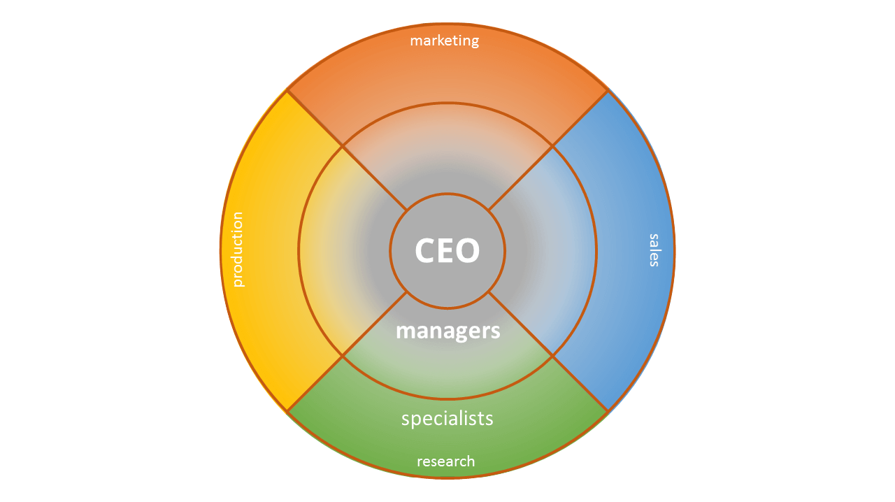 Aunque en este tipo de organigrama no desaparece la estructura jerárquica, esta se suaviza, pues la dirección no se encuentra en la cúspide de la organización sino en una posición central. Esto lleva implícita la idea de que el CEO no interviene tan directamente en el trabajo de los empleados y en su lugar comunica sus visiones empresariales de dentro hacia fuera. Solo existen algunos niveles en la dirección intermedia, por lo que los jefes de departamento suelen tener a su cargo a un mayor número de empleados, esto es, la cadena de mandos es más corta.