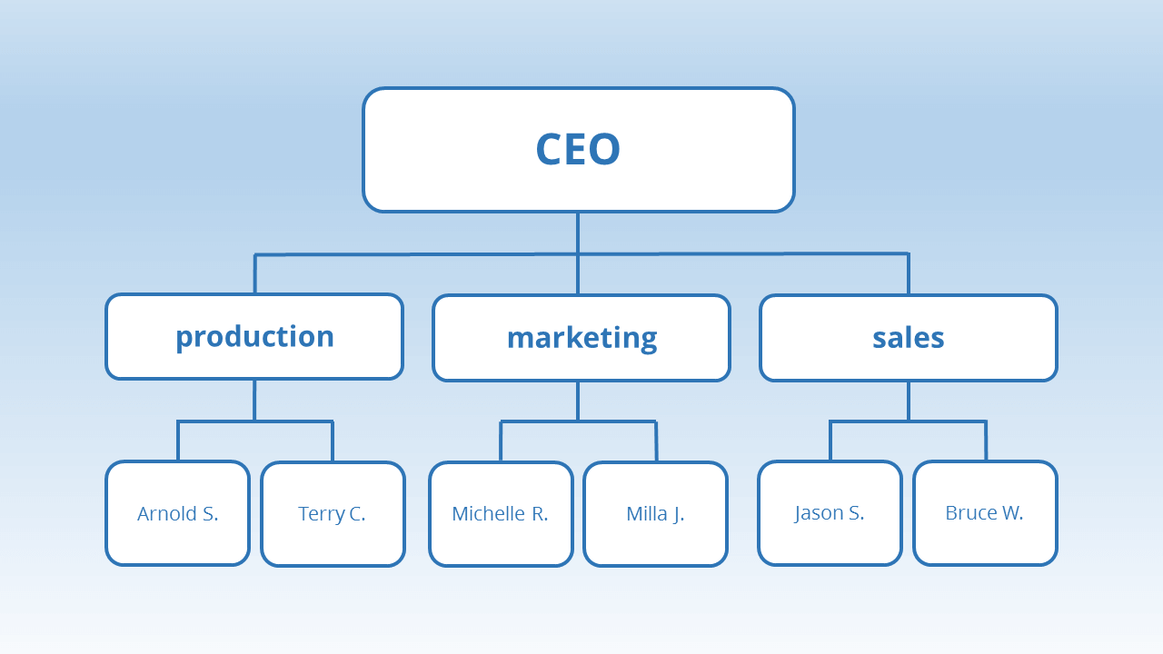 - Cadena de mando (larga o corta): se trata del componente base de una estructura organizativa. Con el concepto cadena de mando se hace referencia a la línea de autoridad ininterrumpida entre la dirección y los empleados. Con ella se establece a quién hay que dirigirse según qué tema dentro de la estructura empresarial (también conocido como reporting)