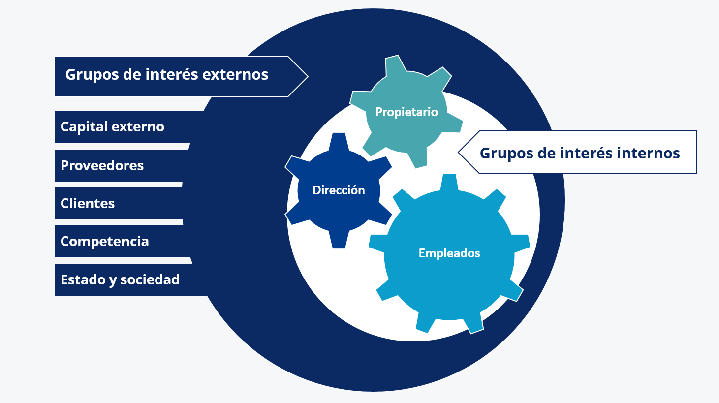 Los grupos de interés y las partes interesadas de una empresa se dividen en internos y externos. Los stakeholders internos son los empleados de la empresa o los inversores de la misma. Por lo general, se habla de tres grupos de interés internos con diferentes objetivos y motivaciones: propietarios/accionistas, directivos y empleados.