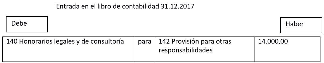 El flujo de pago por el valor de 14.000 € se incluye en el lado derecho (haber) con el registro “142 Provisión para otras responsabilidades”. En el lado izquierdo se especifica el motivo del gasto bajo “140 Honorarios legales y de consultoría”. Aquí se incluyen otros flujos de cobro que reducirán el beneficio anual de tu negocio.