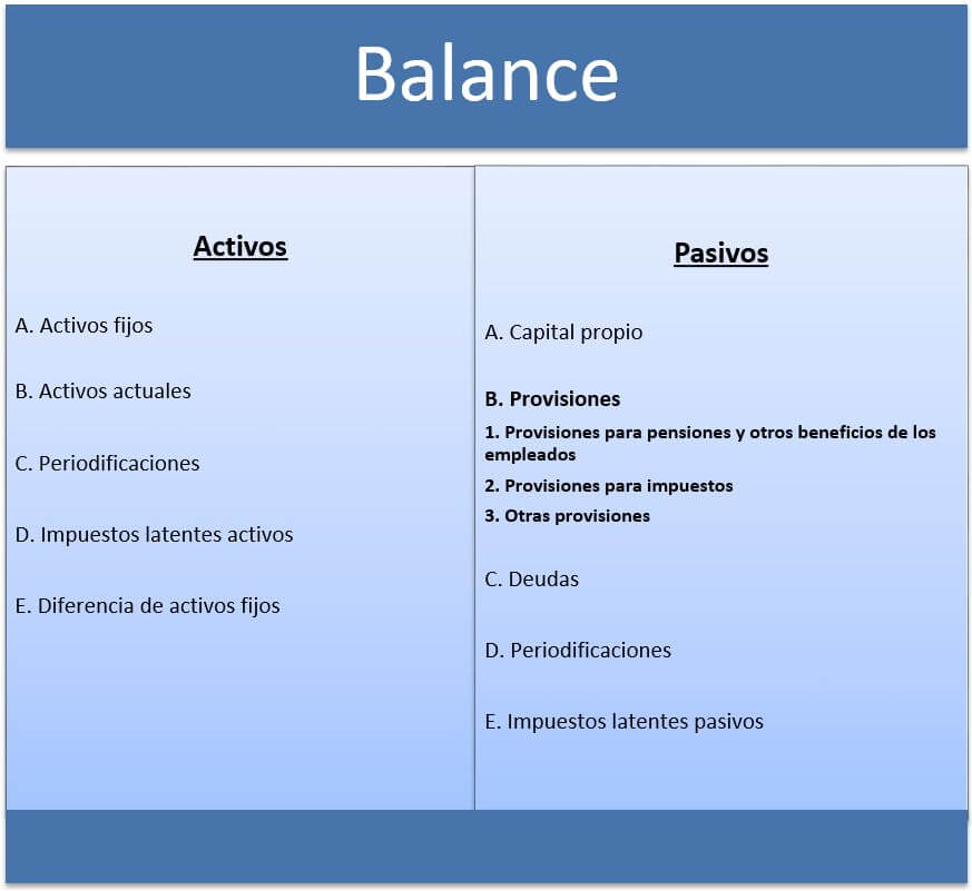 El hecho de que las provisiones sean reservas las ubica en el sector pasivo de un balance. Para la contabilidad esto significa que el flujo de pagos se registra como debe (izquierda) y el flujo de cobros como haber (derecha). En el punto 14 de la quinta parte del Plan General Contable encontrarás un listado general de aquellas provisiones que puedes incluir en el balance general de tu empresa. Entre ellas se encuentran: