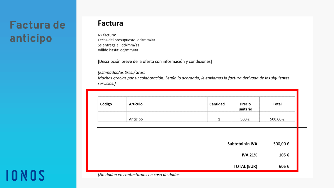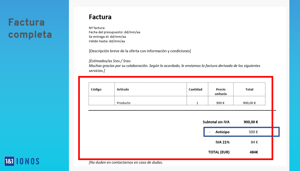 • El total de la factura final es la diferencia entre el subtotal y el anticipo (400 €) más el IVA correspondiente (84 €).