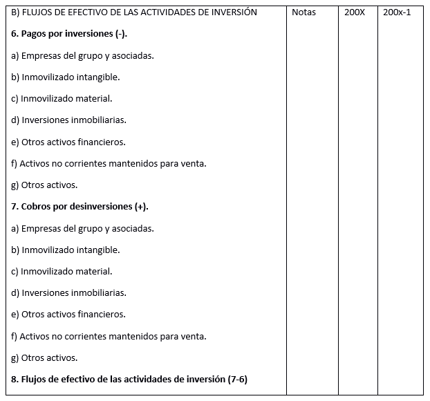 Según informa el Plan General Contable español, el flujo de efectivo procedente de actividades de inversión se compone de “los pagos que tienen su origen en la adquisición de activos no corrientes y otros activos no incluidos en el efectivo y otros activos líquidos equivalentes, tales como inmovilizados intangibles, materiales, inversiones inmobiliarias o inversiones financieras, así como los cobros procedentes de su enajenación o de su amortización al vencimiento.”